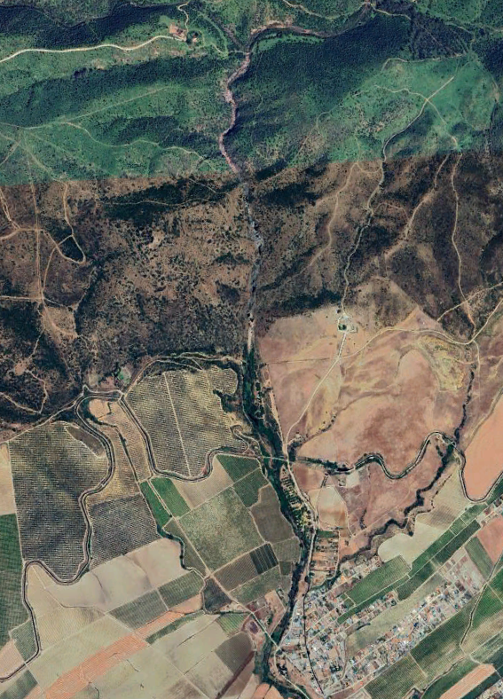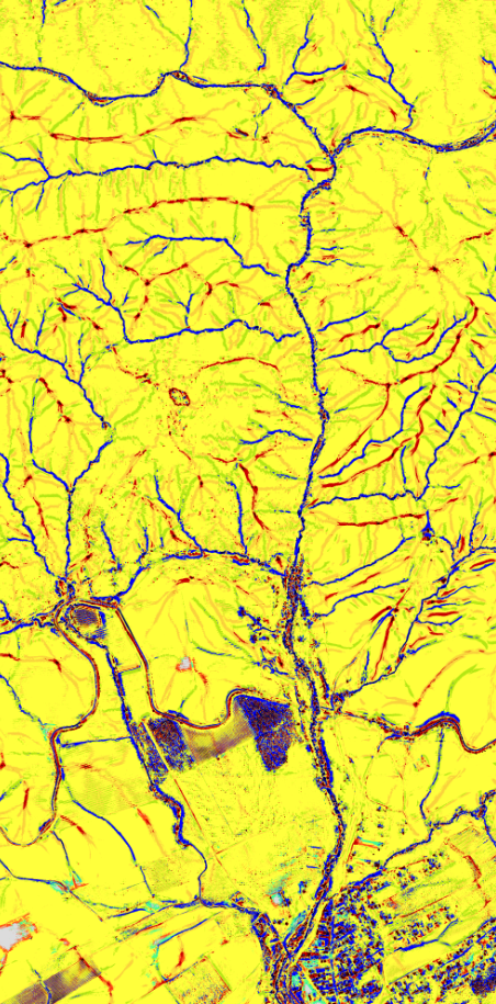 In recent years, geophysicists have constructed algorithms for processing digital elevation maps in order to categorize their features into the 10 most common geomorphometric features. QGIS offers an exceptionally quick version of this via its use of the GRASS r.geomorphon processing method. One easily seen use of this is for the following archaeological application. In the satellite image below, nothing stands out: