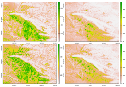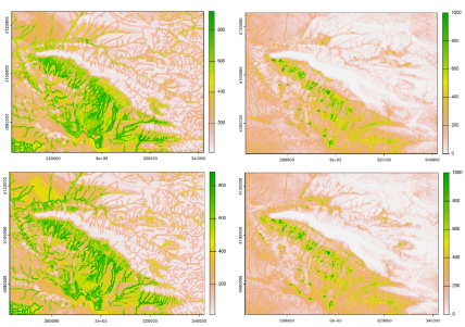 Below are the sresultant predictive maps. Note the similarity in output between the distance to water covariate and the final predictive map.