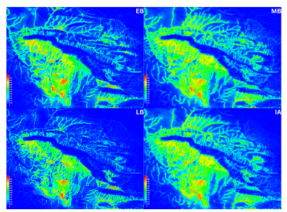 GBM (Left Column) and RF (Right Column) Predictive Maps in order from EB, MB, LB, IA. Color is correlated with probability green denotes approaching 100% and white means approaching 0%. The values of the color bar can be divided by 1000 to get a percentage.