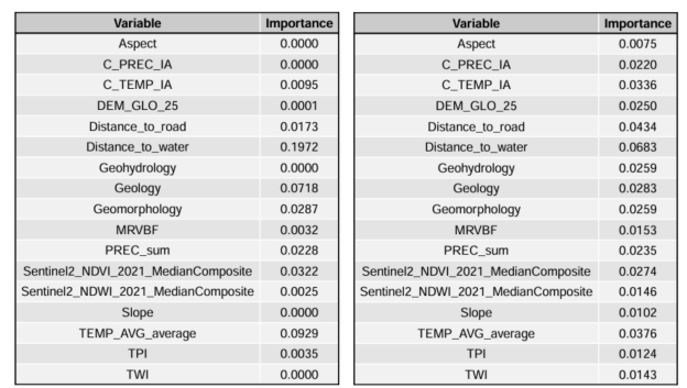 The overreliance on the distance to water can be seen in the variable importance metrics for the different models: