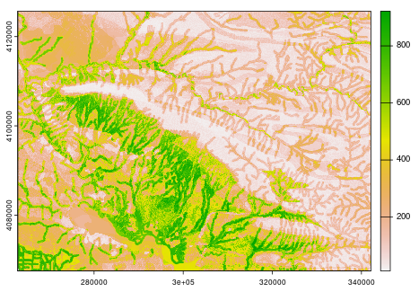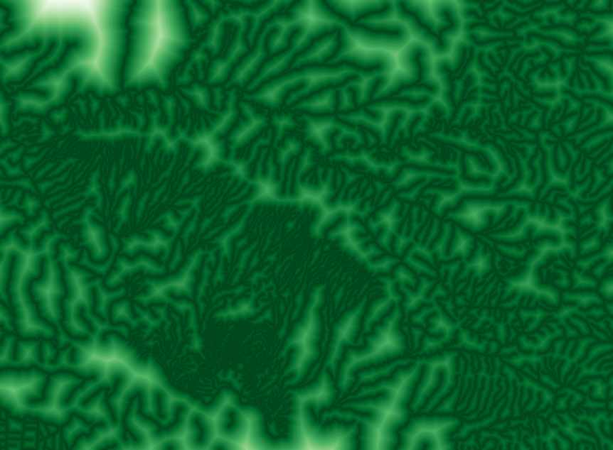 Distanct to water covariate visualized in isolation. The darker green an area is the closer it is geographically to a mapped drainage valley.