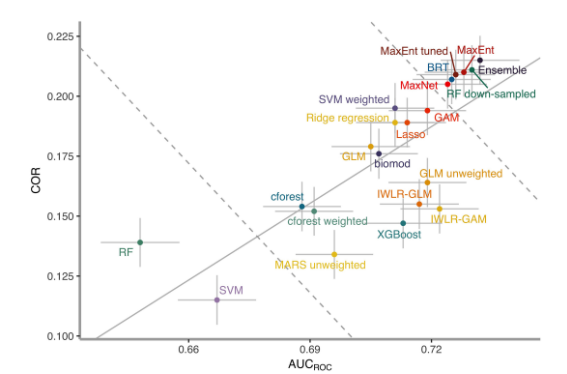 Additionally, Valavi et al. conducted an extensive evaluation of various species distribution modeling (SDM) algorithms, including machine learning and statistical methods. Their study assessed the performance of 20 different models, identifying Boosted Regression Trees (BRT), MaxEnt, a down-sampled Random Forest (RF), and ensemble models as the top performers. The research highlighted the strengths of MaxEnt for its conservative predictions, which is particularly useful in cases with presence-only data, like in archaeological site modeling. This evaluation serves as a benchmark for selecting appropriate models based on the specific requirements and data characteristics in SDM applications.